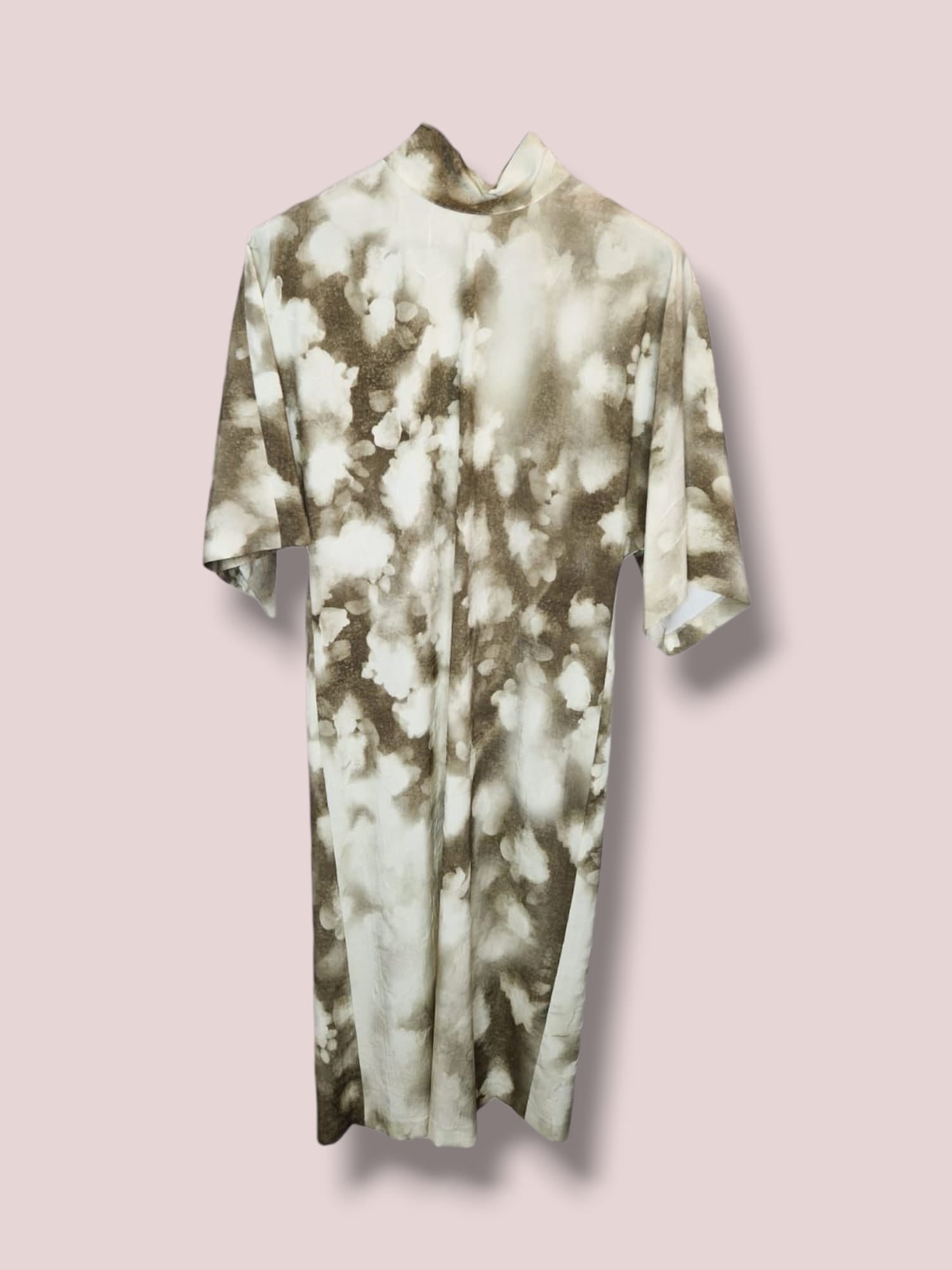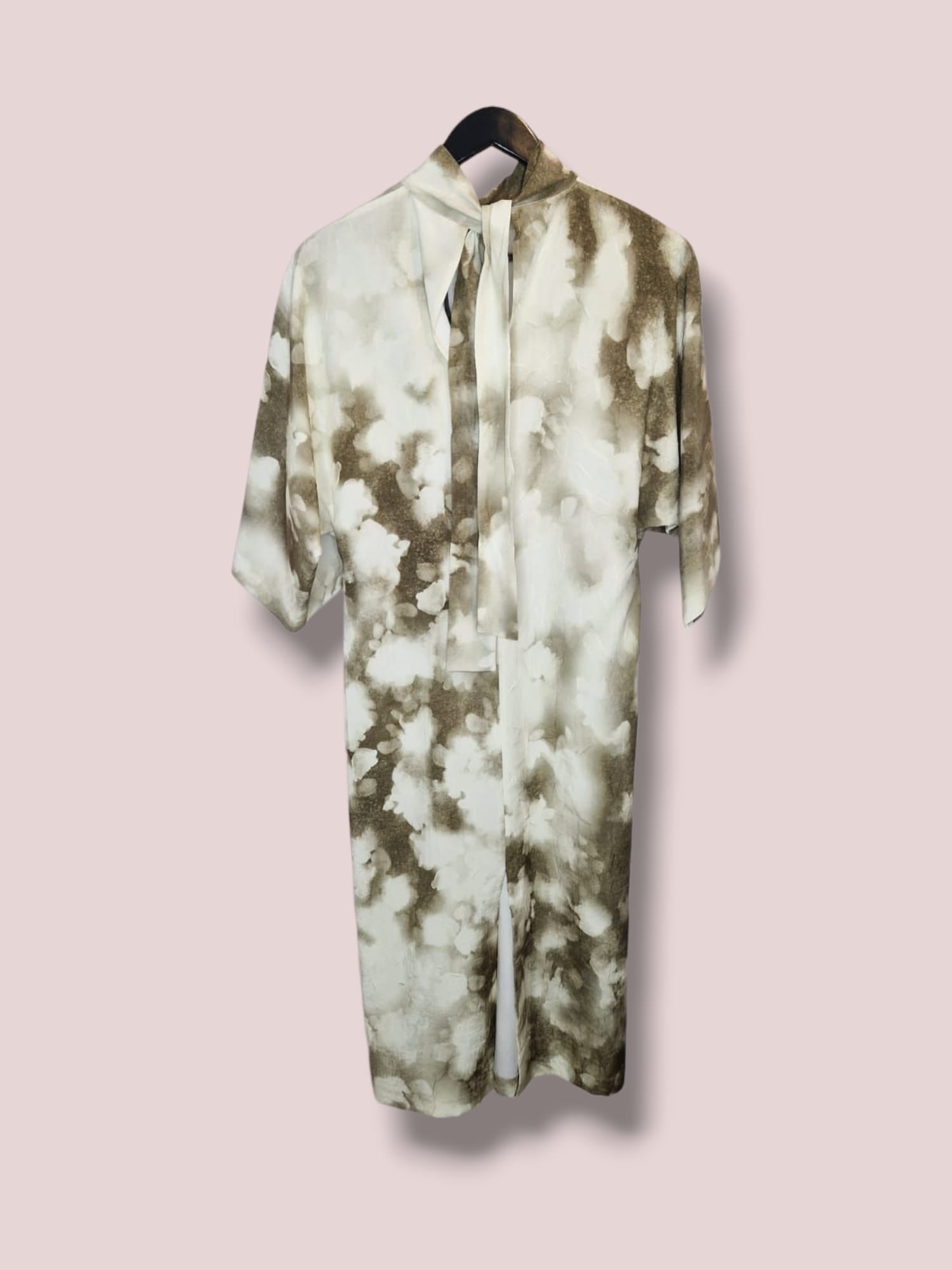 Abito stampato con colletto coreano e chiusura posteriore stile "tunica" . Maniche a kimono e lunghezza midi. Vestibilità regolare. Composizione viscosa 100%