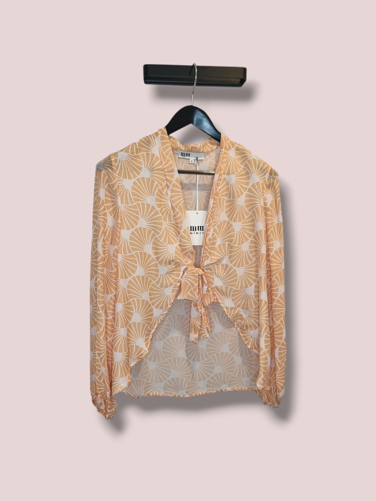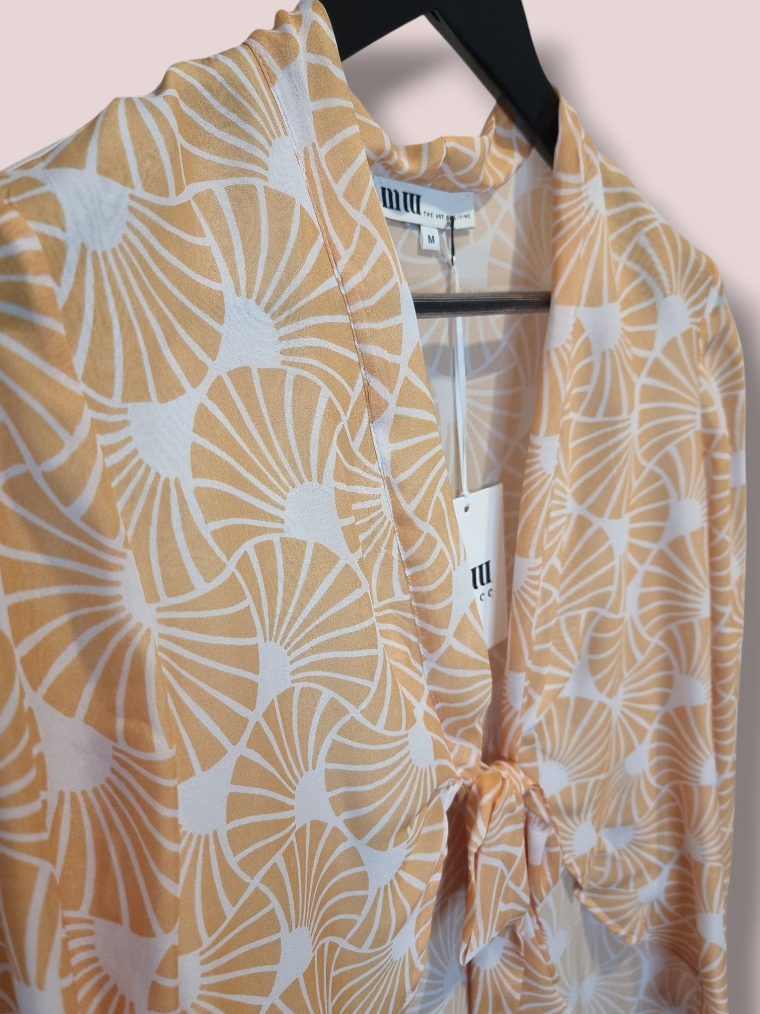 Camicia stampata asimmetrica e abbottonatura con fiocco. Composizione viscosa e seta