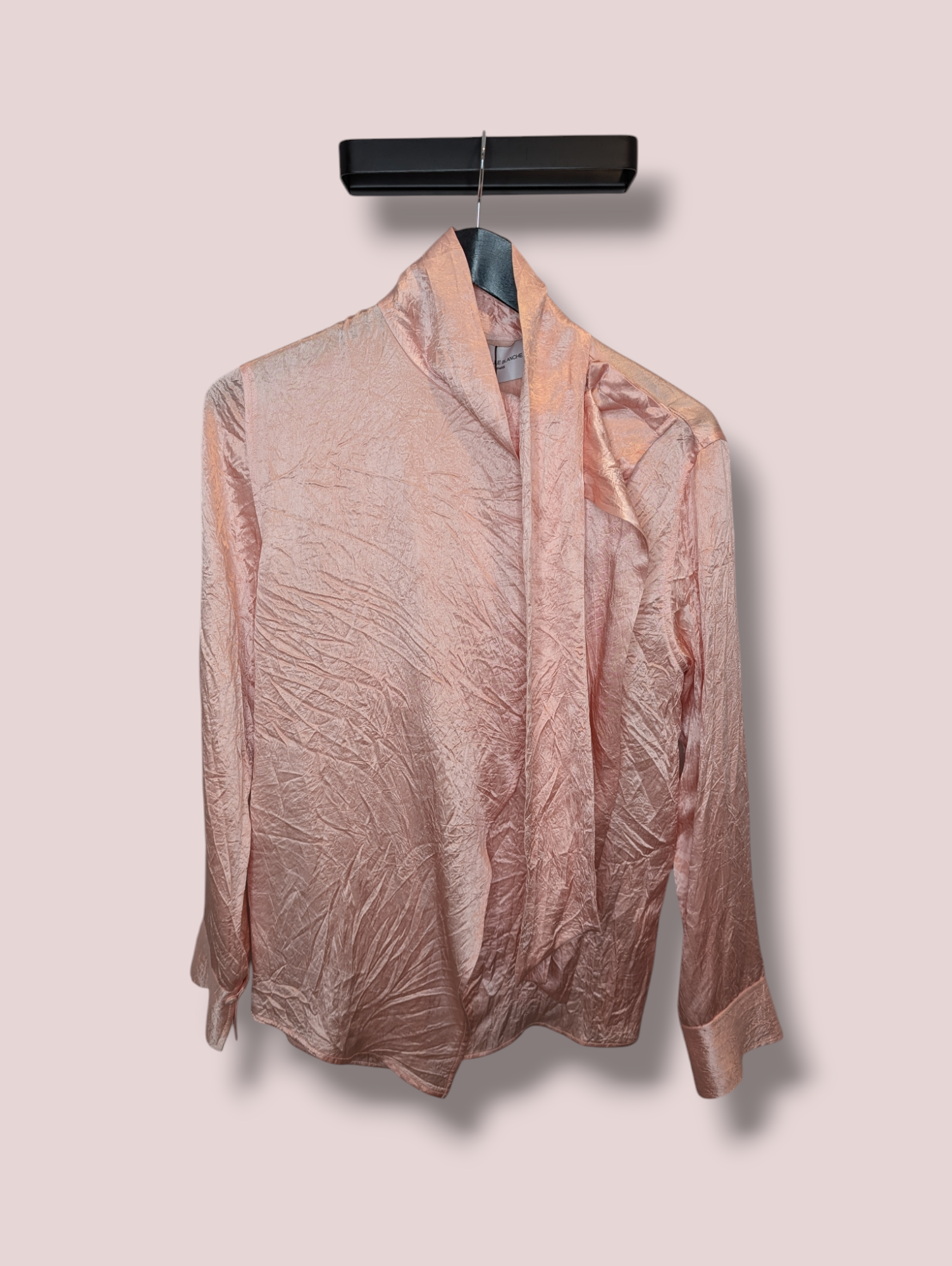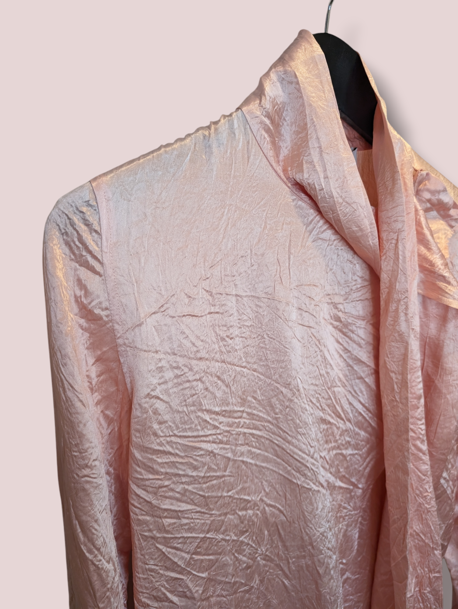 Camicia effetto stropicciato e nastro al collo. Colore rosa. Manica lunga e chiusura asimmetrica. Vestibilità regolare. Composizione acetato