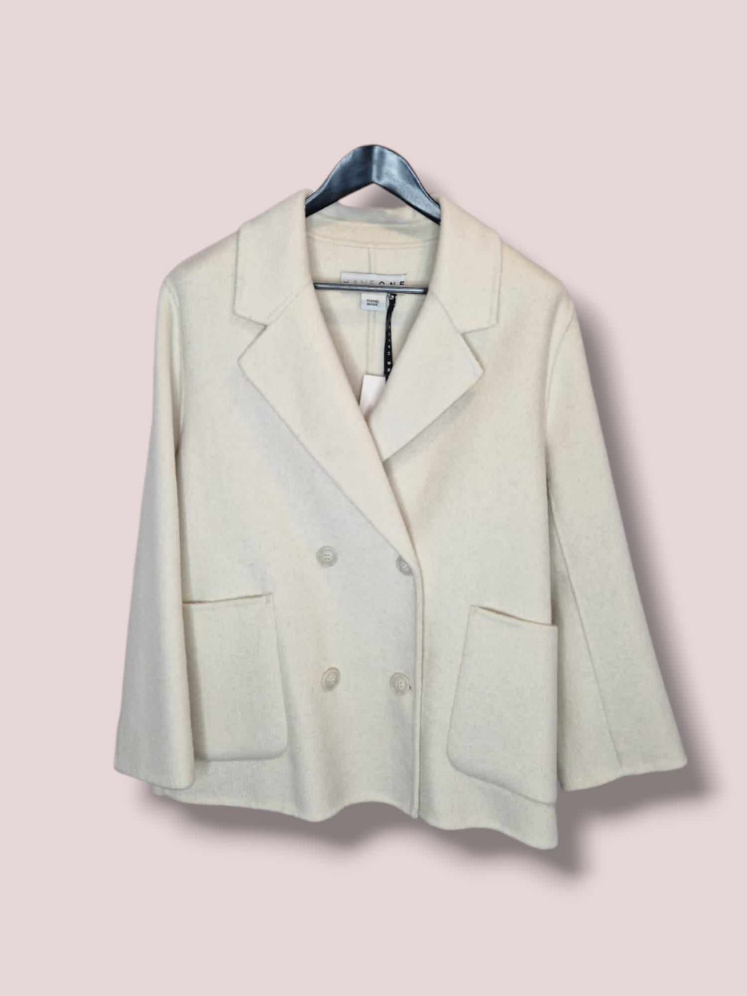 Cappotto doppio petto corto in morbido panno. Vestibilità comoda svasata. Composizione lana, poliestere.