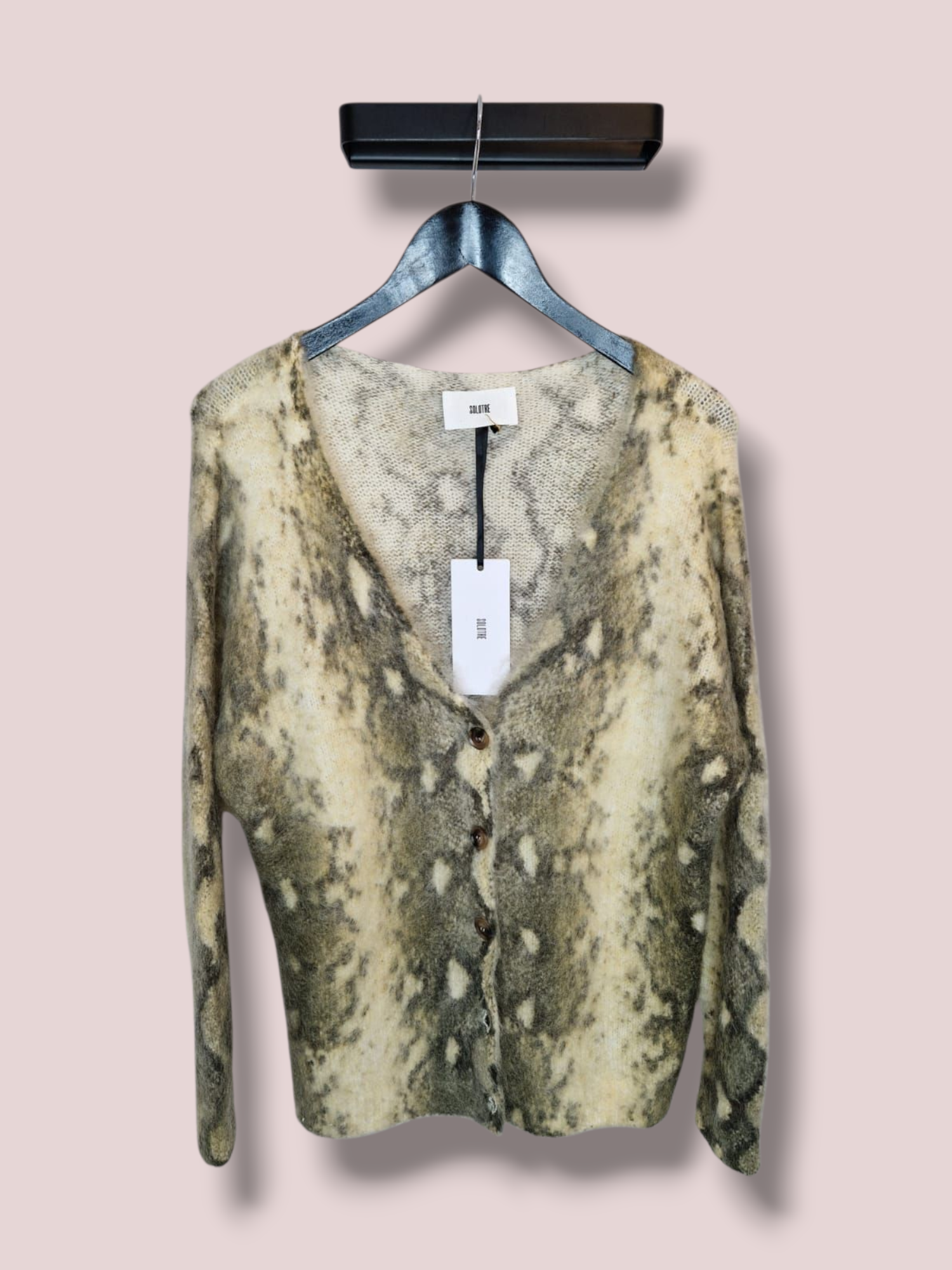 Cardigan jacquard con effetto "pitone" scollo a V e abbottonatura frontale, vestibilità comoda. Composizione mohair, lana, acrilico, elastane