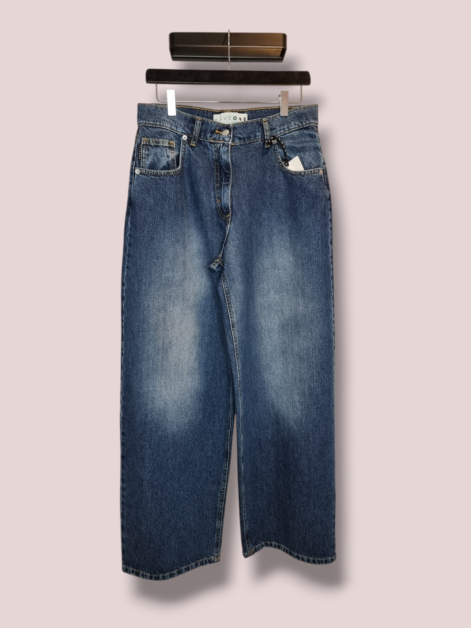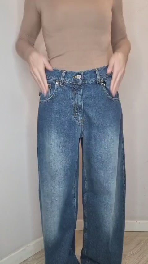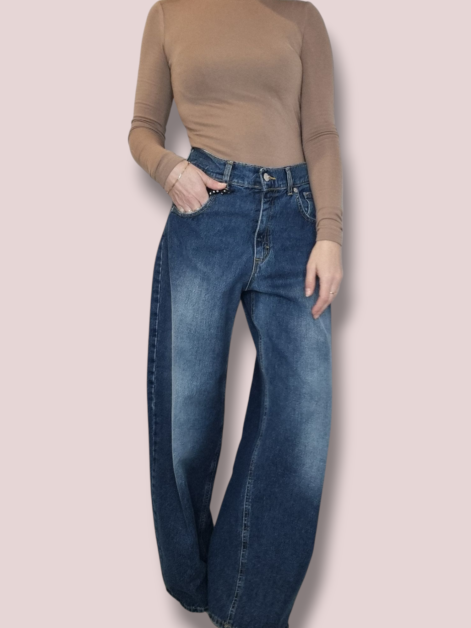 Denim a vita regolare e gamba ampia leggermente baloon e lavaggio scuro. Composizione cotone