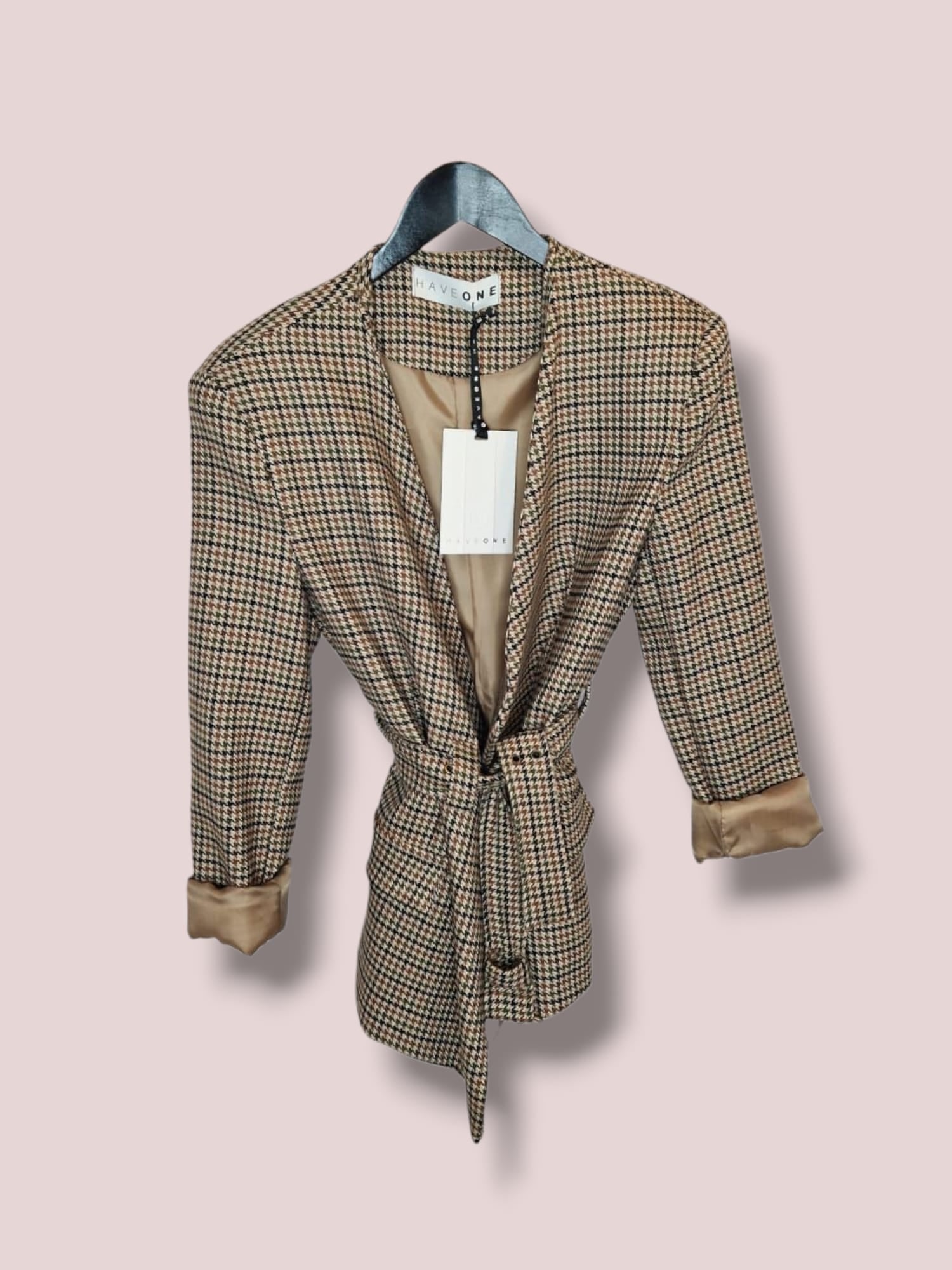 Giacca foderata con motivo pied de-poule e chiusura a " vestaglia" completa di cintura con fibbia dorata. Lunghezza sui fianchi, vestibilità regolare. Composizione poliestere, viscosa, elastame