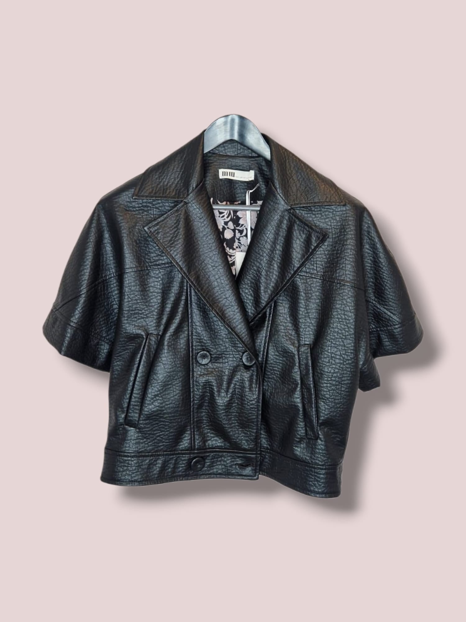 Giacca a mezza manica raglan in ecopelle martellata con abbottonatura doppio petto e fodera interna stampata floreale. Vestibilità comoda. Composizione fodera poliestere, cotone, viscosa. Composizione ecopelle poliestere