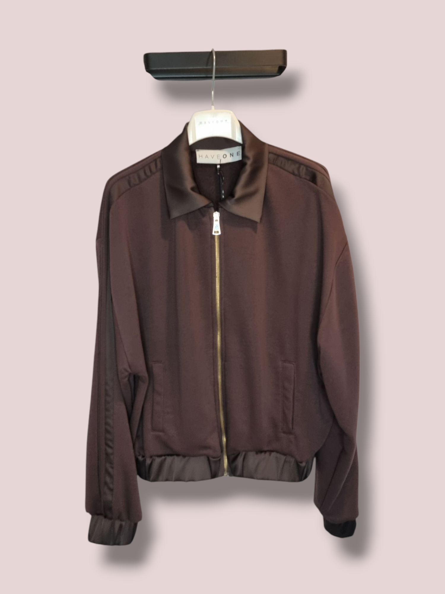Giacca sportiva con chiusura a zip in galvanica dorata e dettagli di profili e colletto in satin. Composizione cotone felpato e poliestere