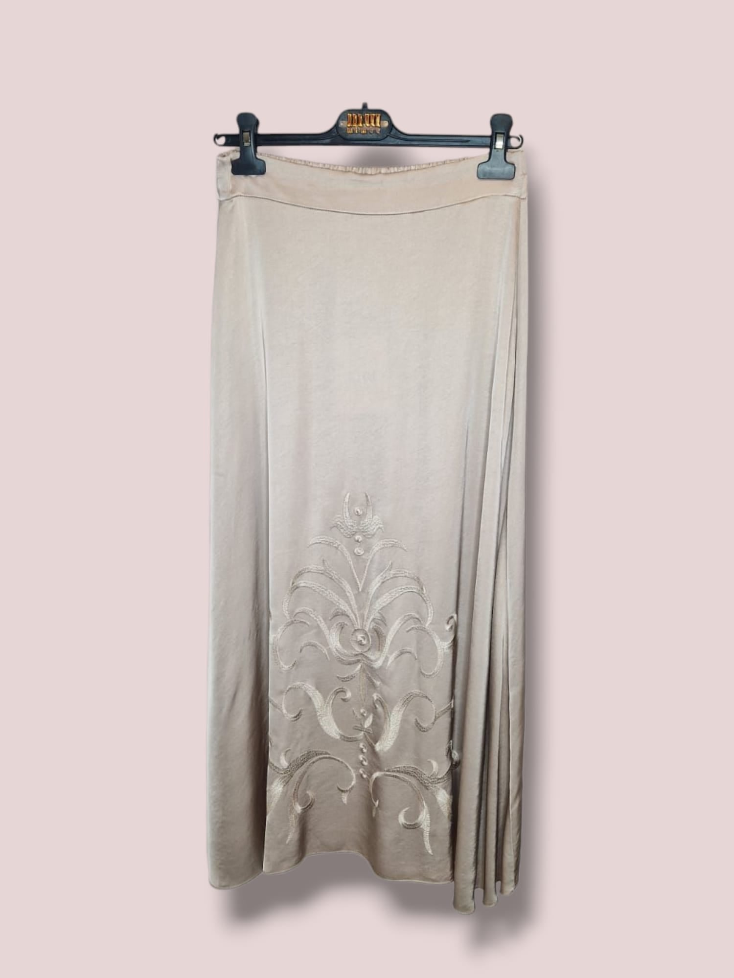 Gonna in fluido di viscosa lucida con elastico e baschina in vita. Ricami nella parte frontale. Vestibilità regolare. Composizione viscosa 100%