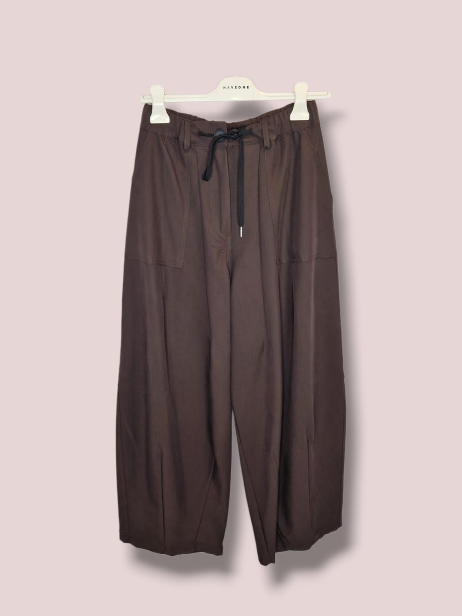 Pantaloni stile "baggy" con elastico, coulisse in vita e e tasche. Chiusura con un bottone. Vestibilità comoda. Composizione viscosa, poliestere