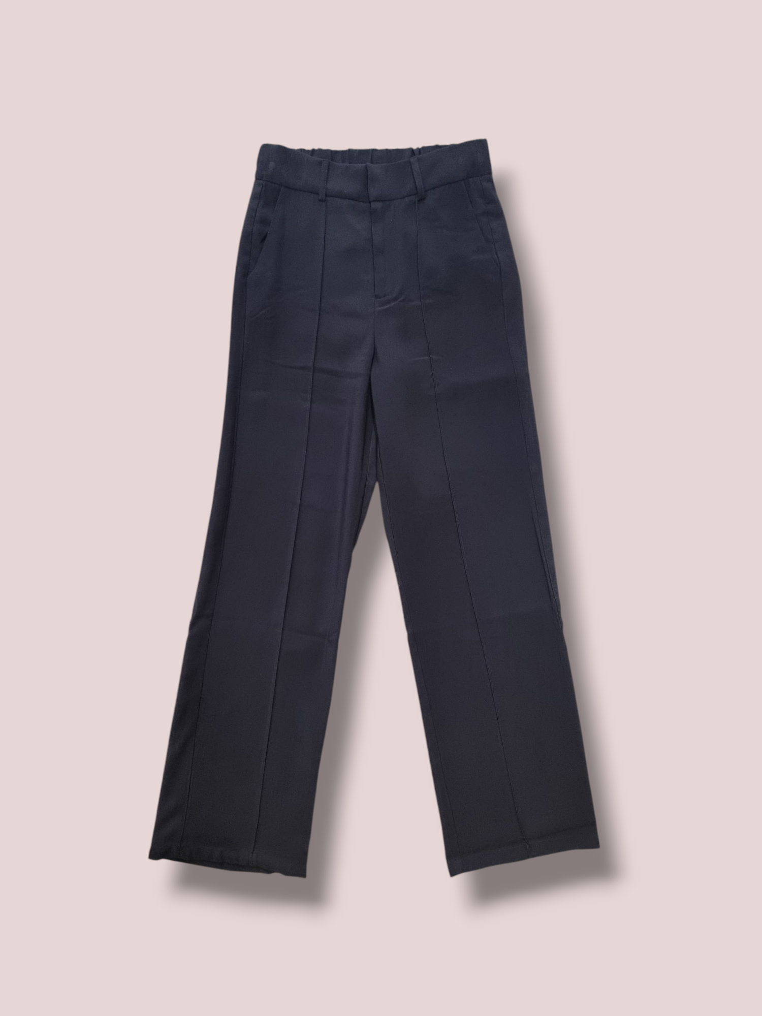 Pantaloni con piega anteriore, gamba dritta ed elastico in vita posteriore. Chiusura con ganci e zip galvanica silver. Composizione viscosa