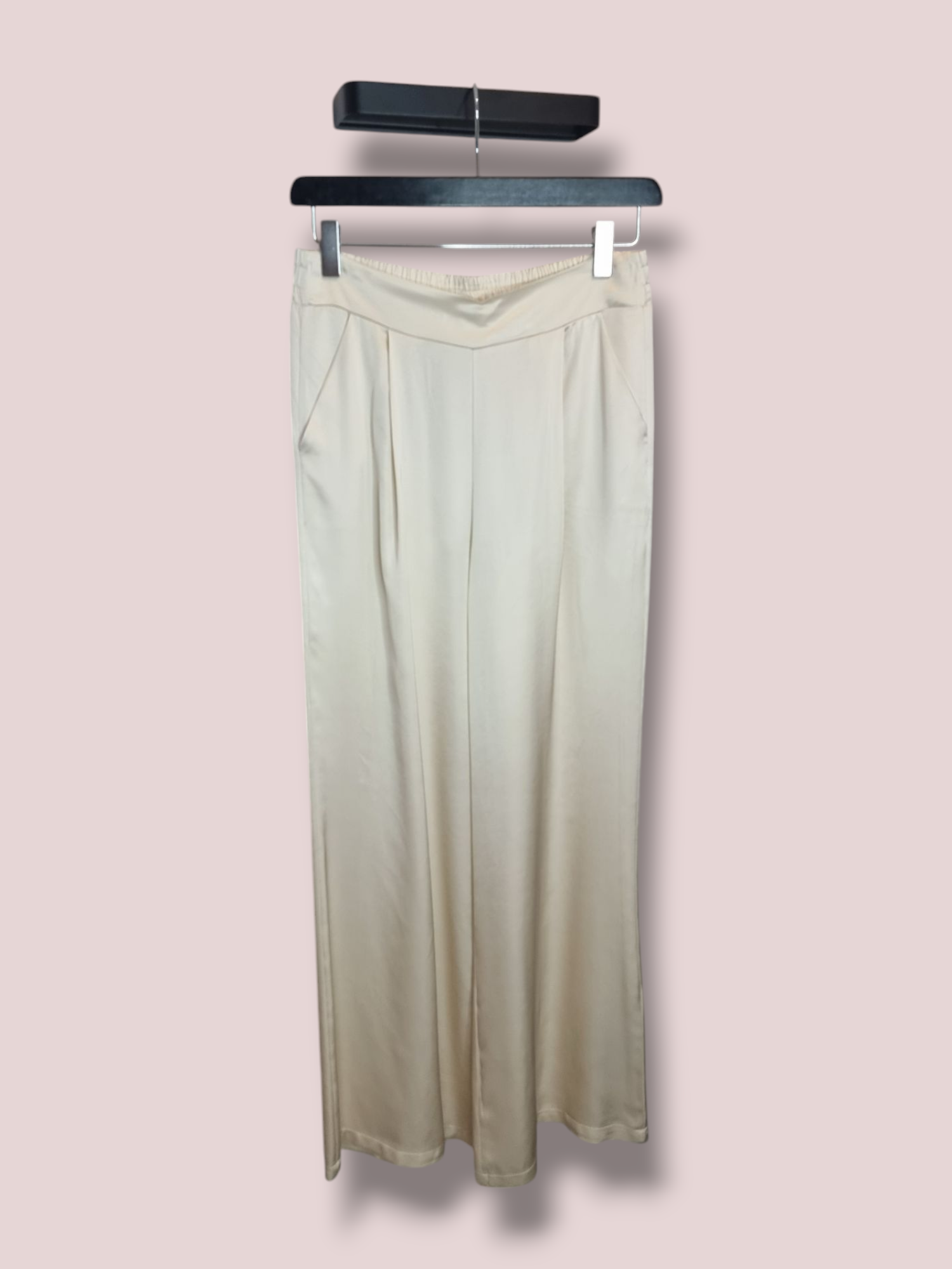 Pantaloni effetto raso a gamba ampia con baschina, elastico in vita e pince aperte. Composizione viscosa 100%