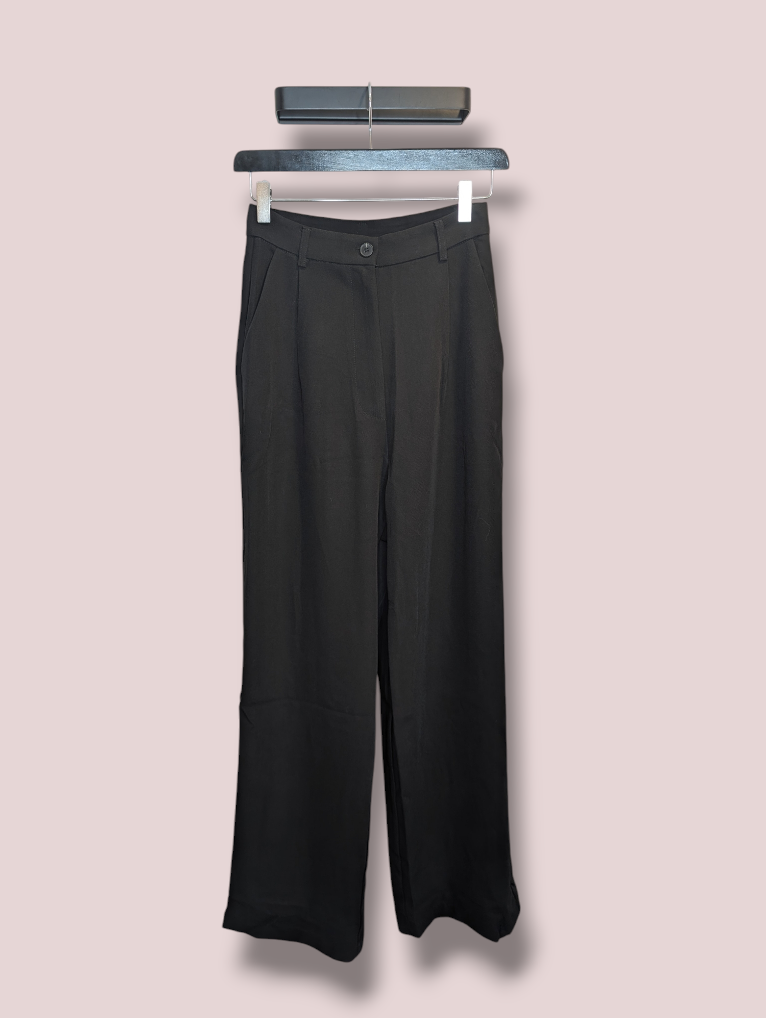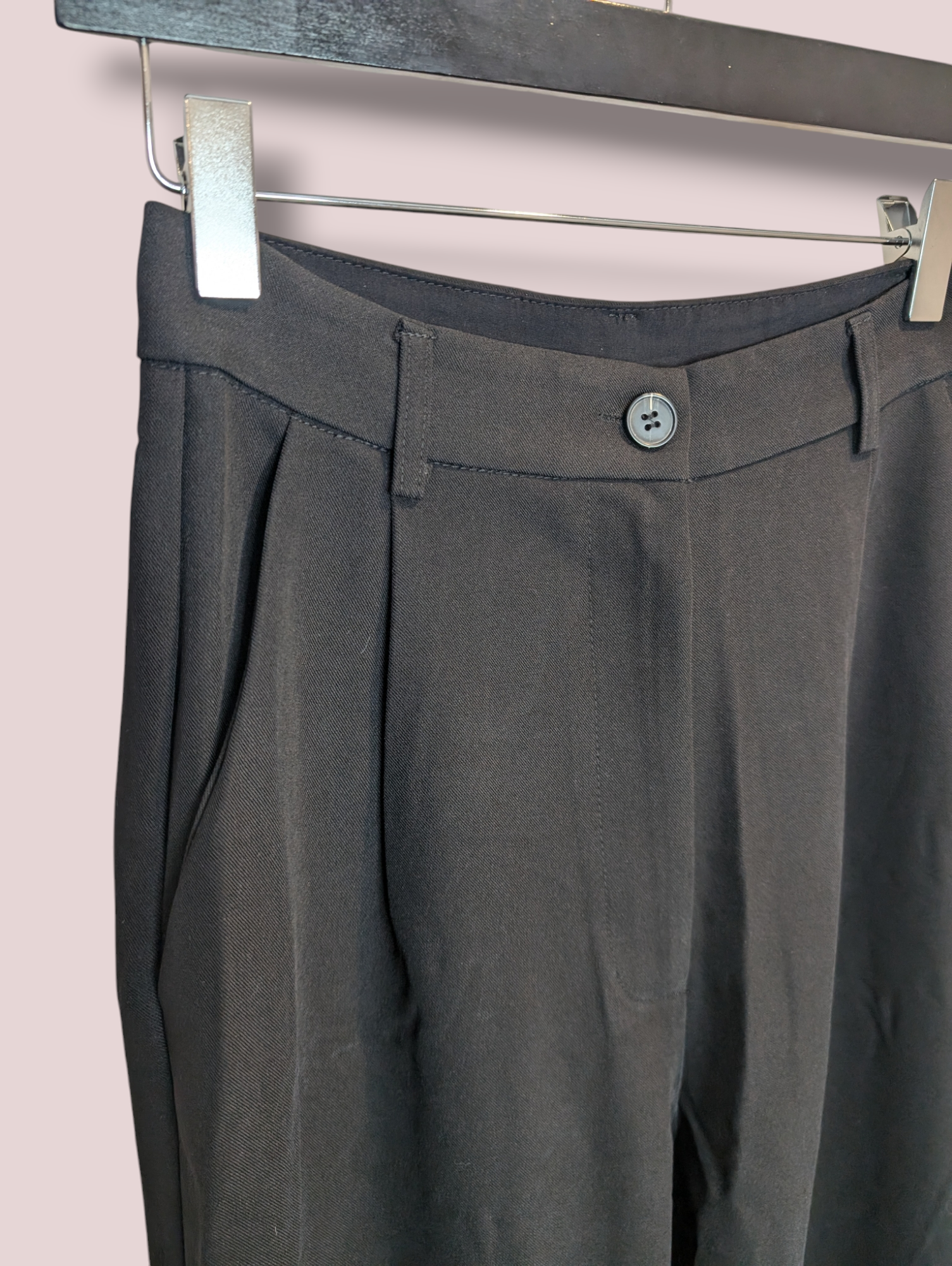 Pantaloni a gamba ampia con pinces, abbottonatura in vita e passanti. Vestibilità piccola e vita regolare. Composizione poliestere ed elastame