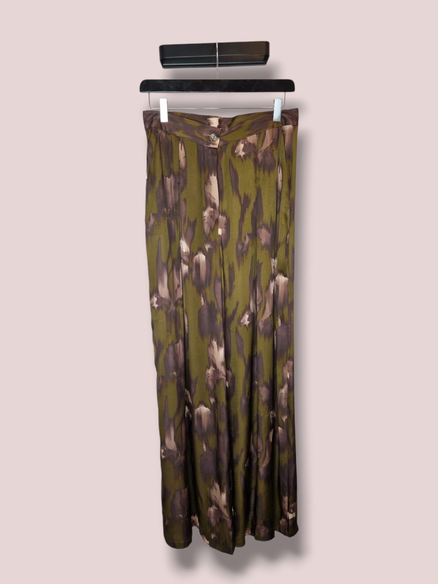 Pantaloni stampati a gamba ampia con baschina e tasche anteriori. Vestibilità comoda. Composizione viscosa 100%