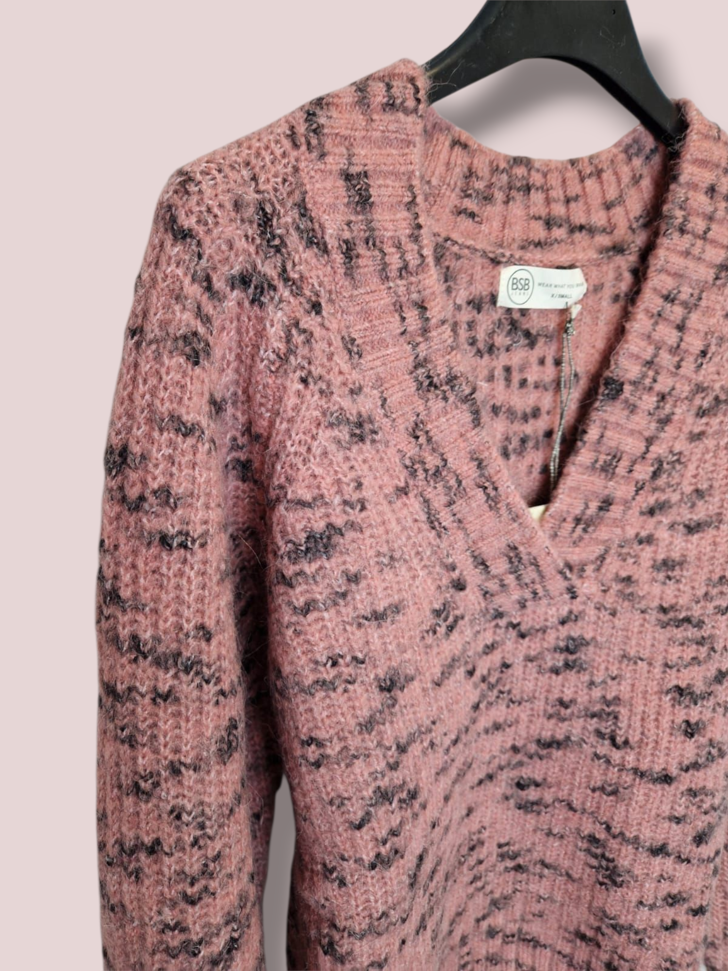 Pullover con scollo a V e lavorazione screziata grigio perla e nero. Vestibilità comoda. Composizione rayon, mohair, lana, elastane
