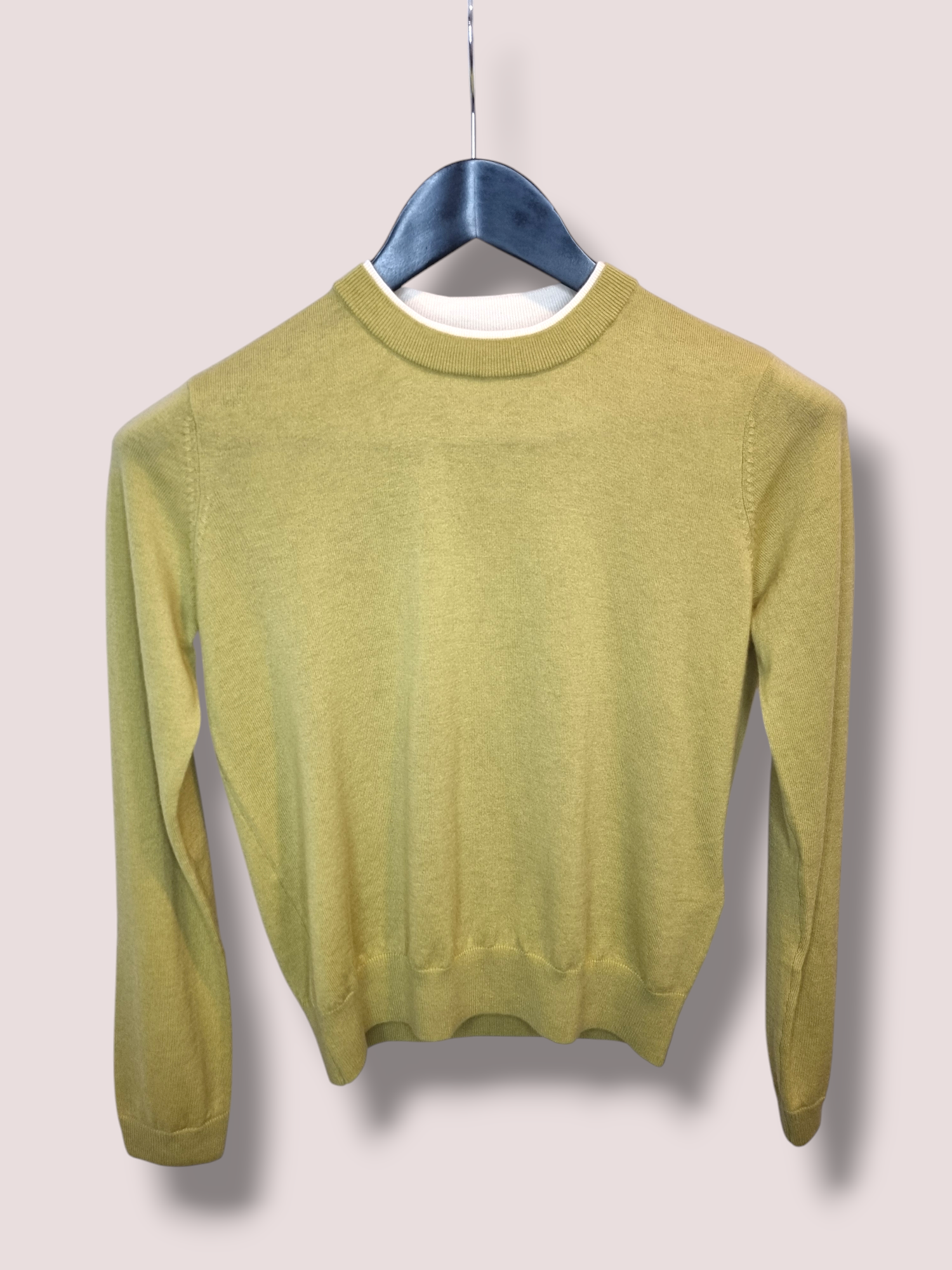 Pullover in 100% lana sottile girocollo con dettaglio di doppio colletto a contrasto di colore.
