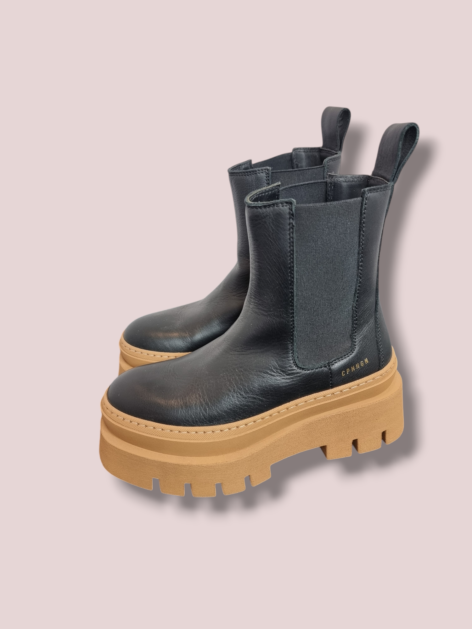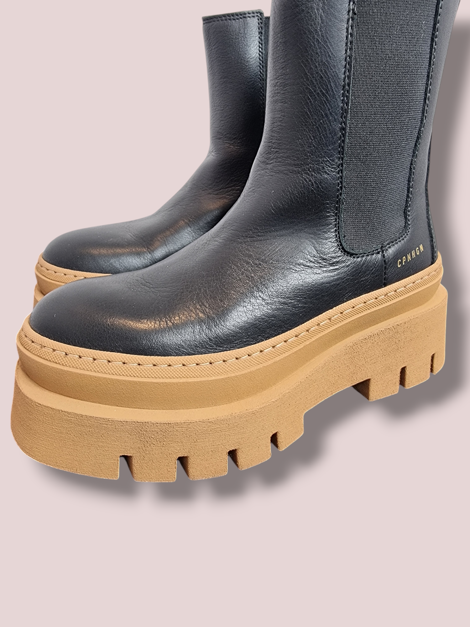 Biker by Copenhagen studio in pelle nera e carrarmato in microfibra variante cognac. Composizione pelle