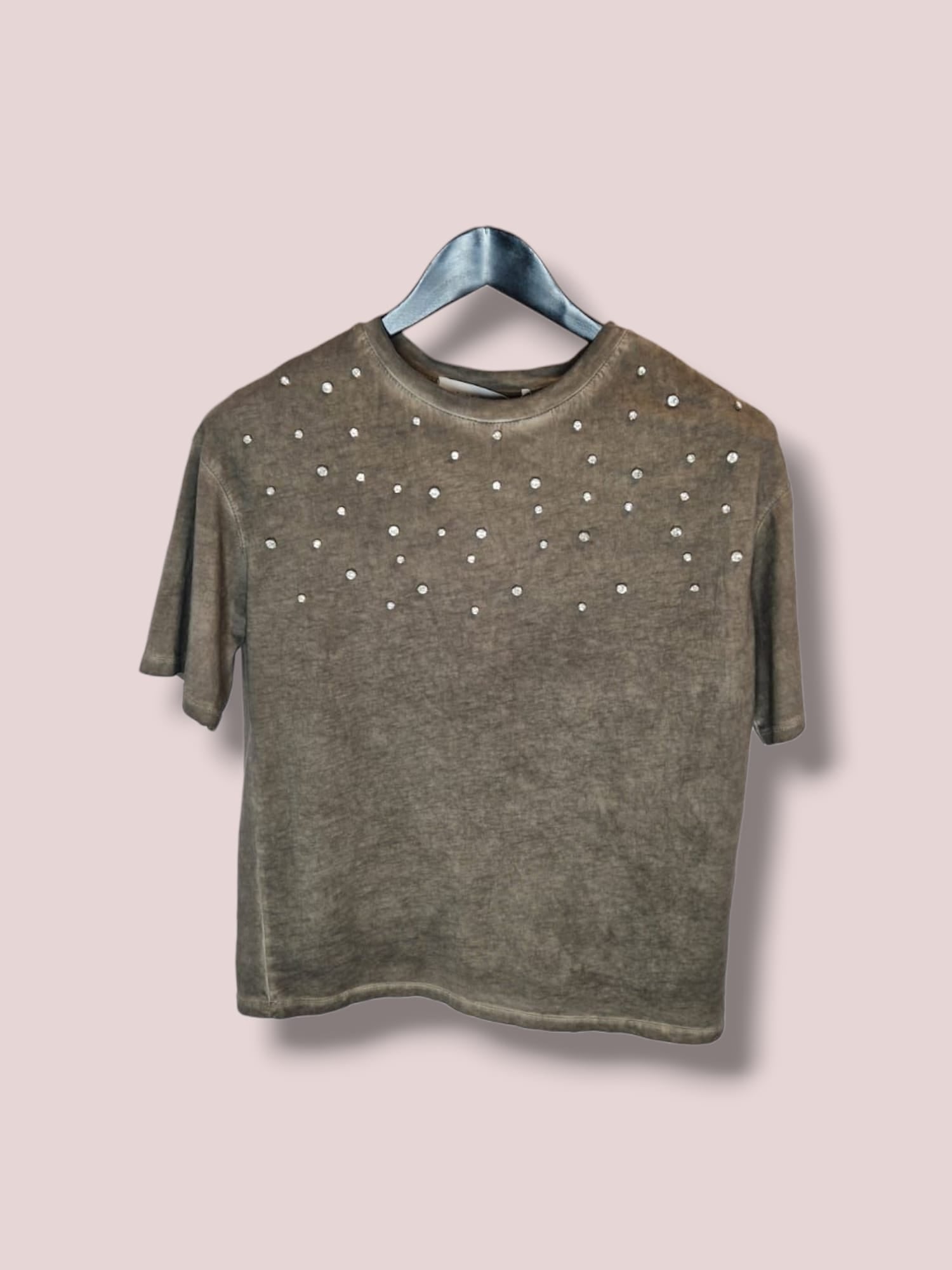 T-shirt a mezza manica con ricamo di castoni silver nella parte anteriore e lavaggio " stone wash". Vestibilità piccola. Composizione cotone 100%