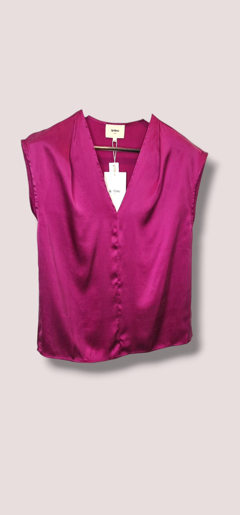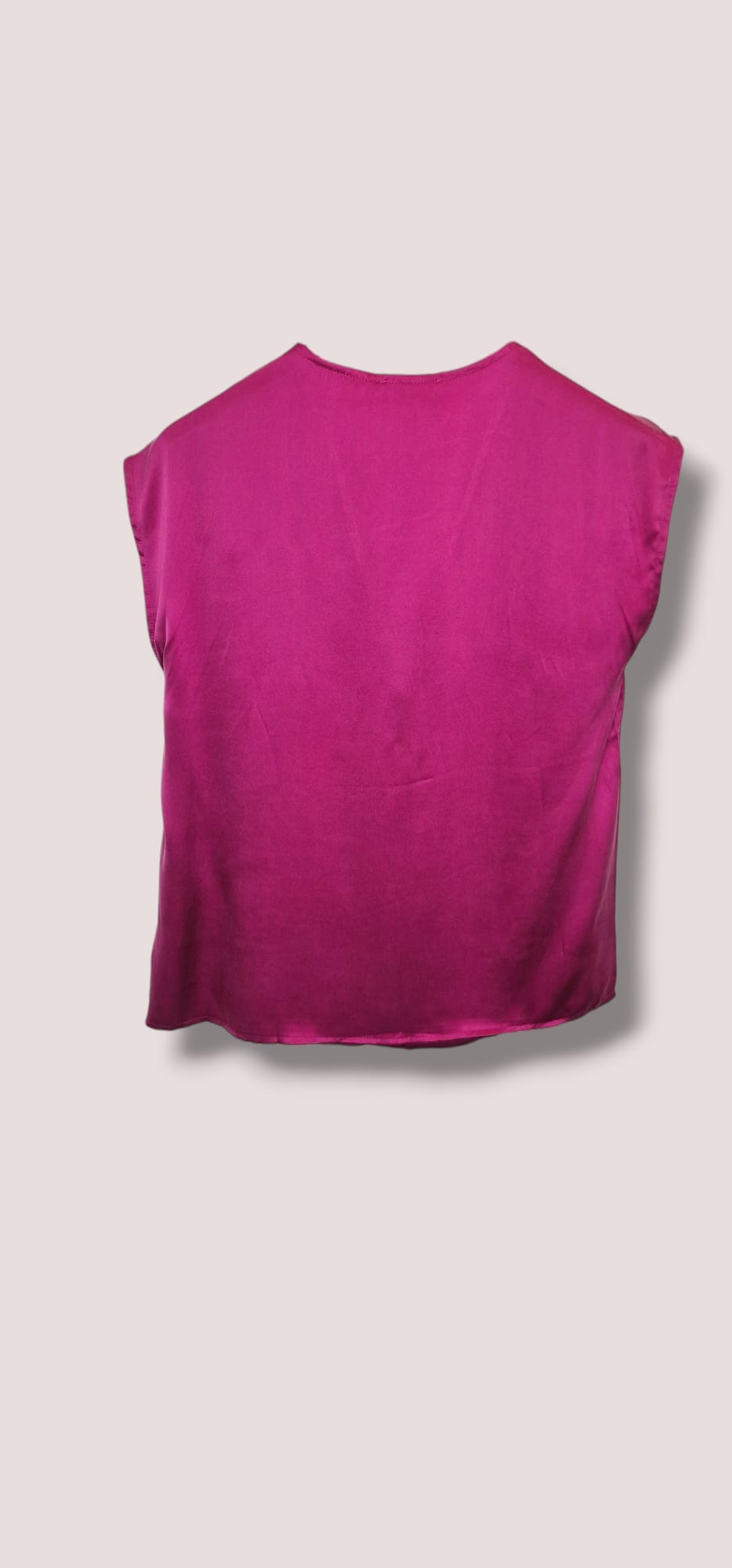 Top smanicato con scollo a V in seta lavata color fuxia. Vestibilità regolare. Composizione 100% seta