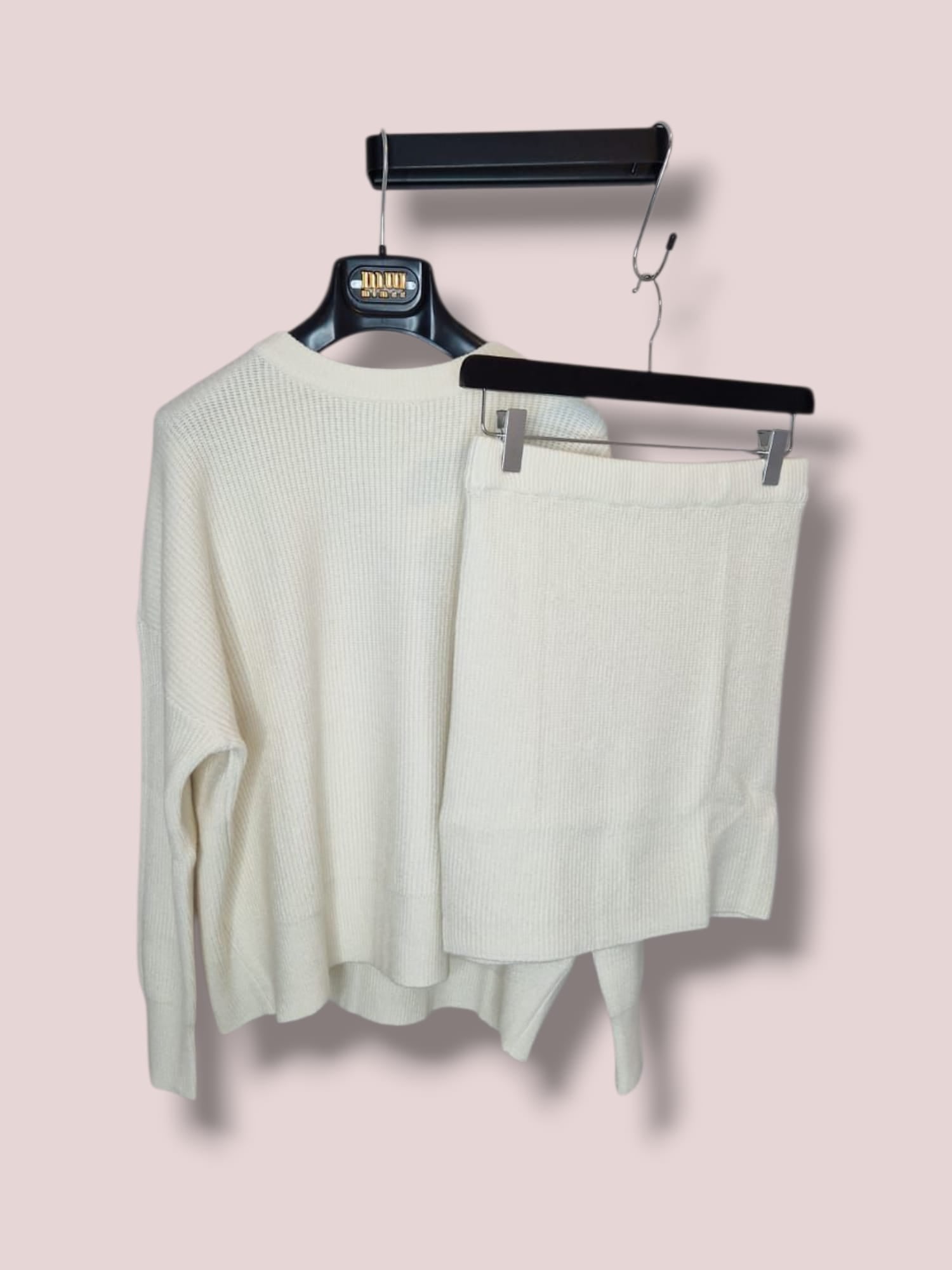 Twin-set composto da pullover girocollo con spalla scesa e gonna in maglia. Composizione viscosa, polibutilene, poliammide